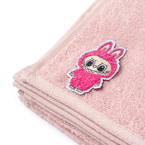 - Labubu logolu yumuşak dokulu pamuk bornoz ve saç havlusu.